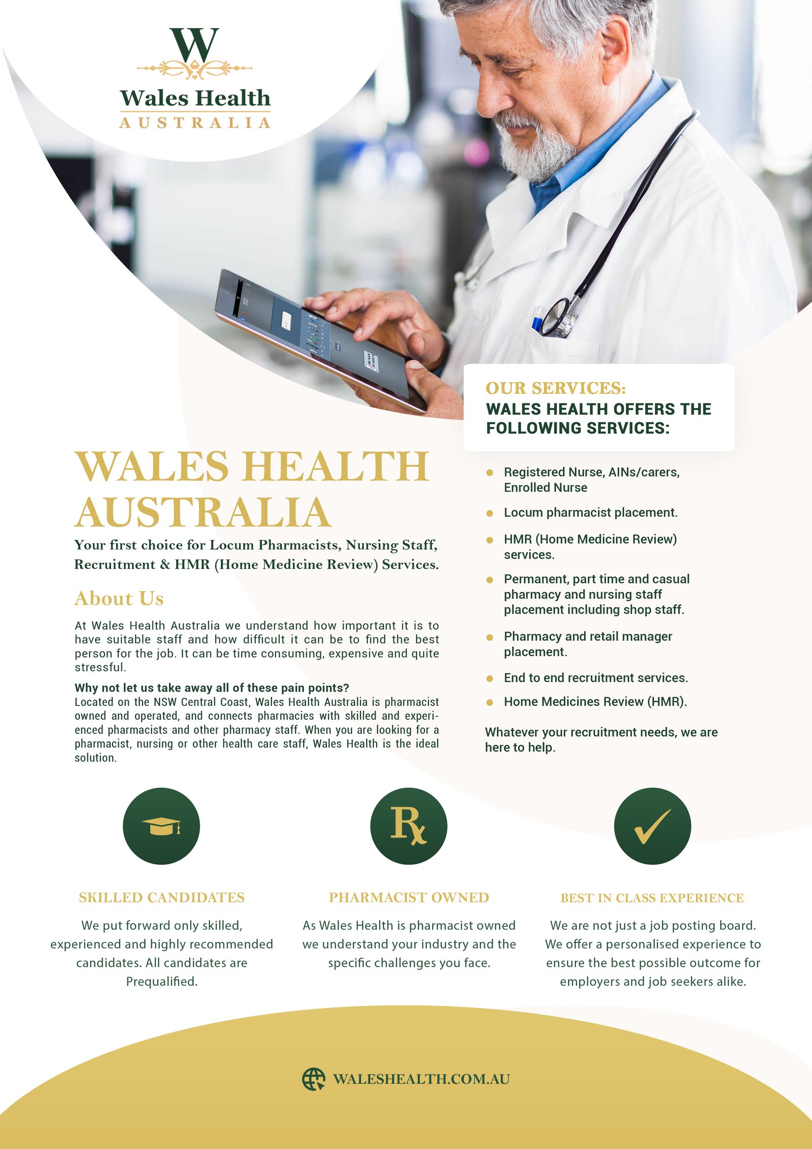 Wales Health Australia specializes in Pharmacists, Nursing Staff, Recruitment, and HMR (Home Medicine Review) Services. For this project, I am tasked with creating digital and print production brochures that effectively communicate the offerings and capabilities of the organization.